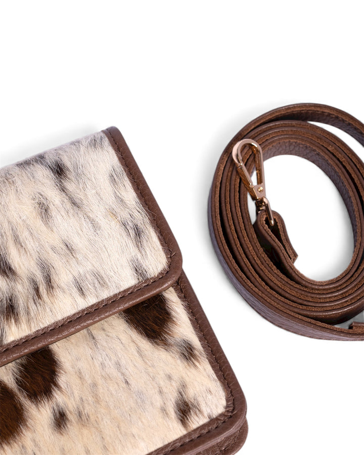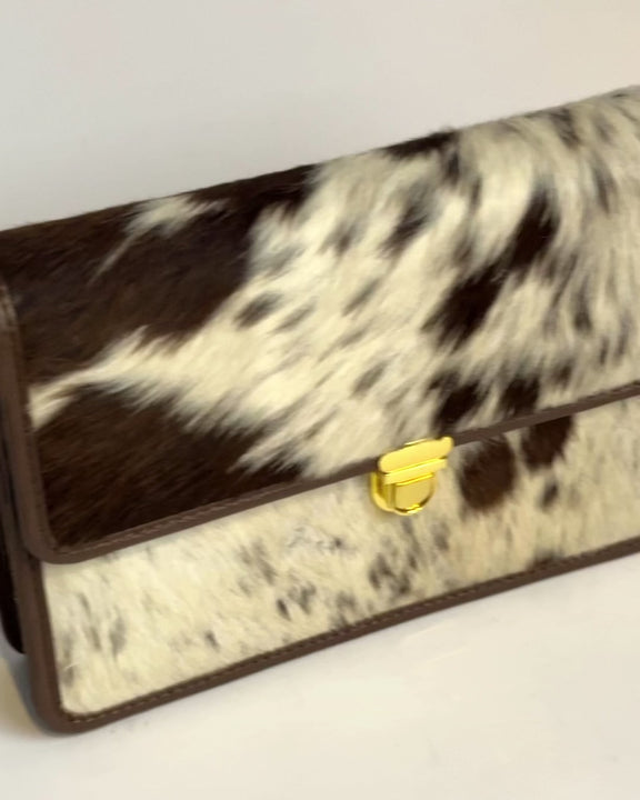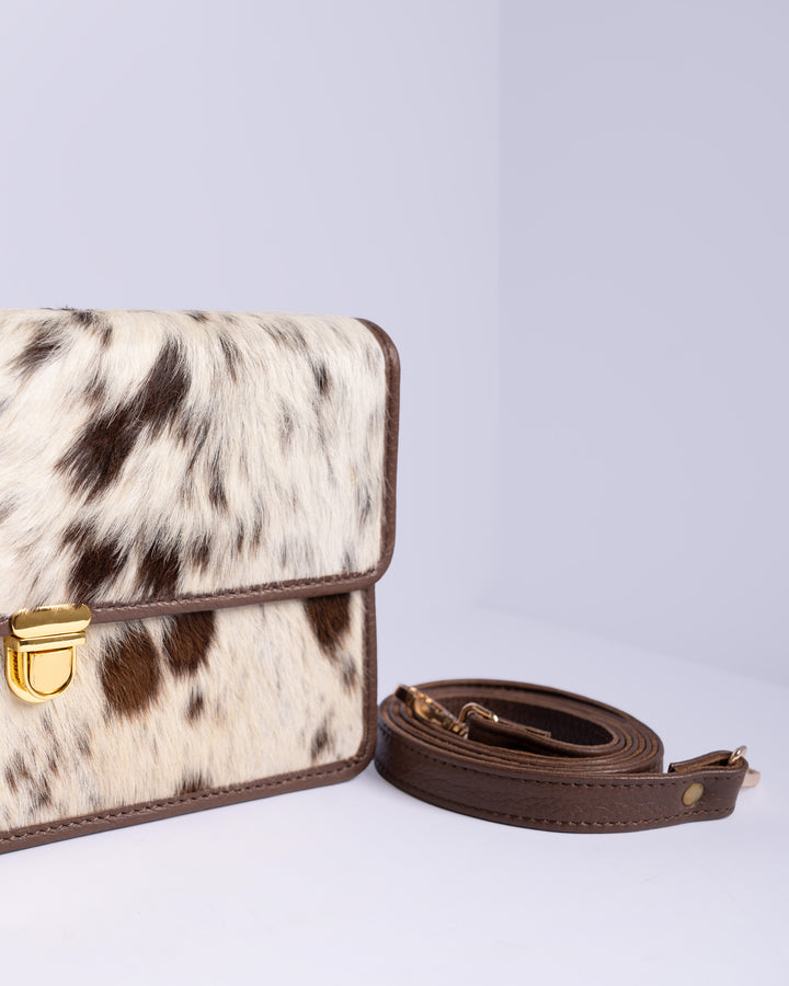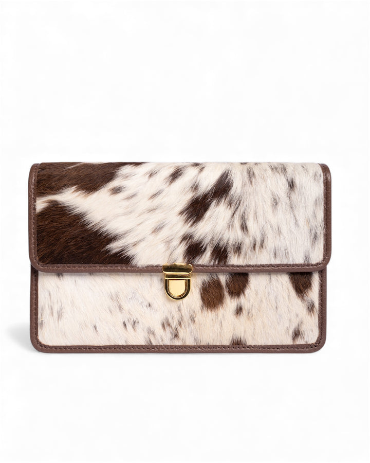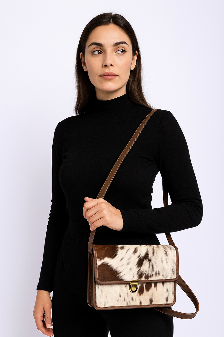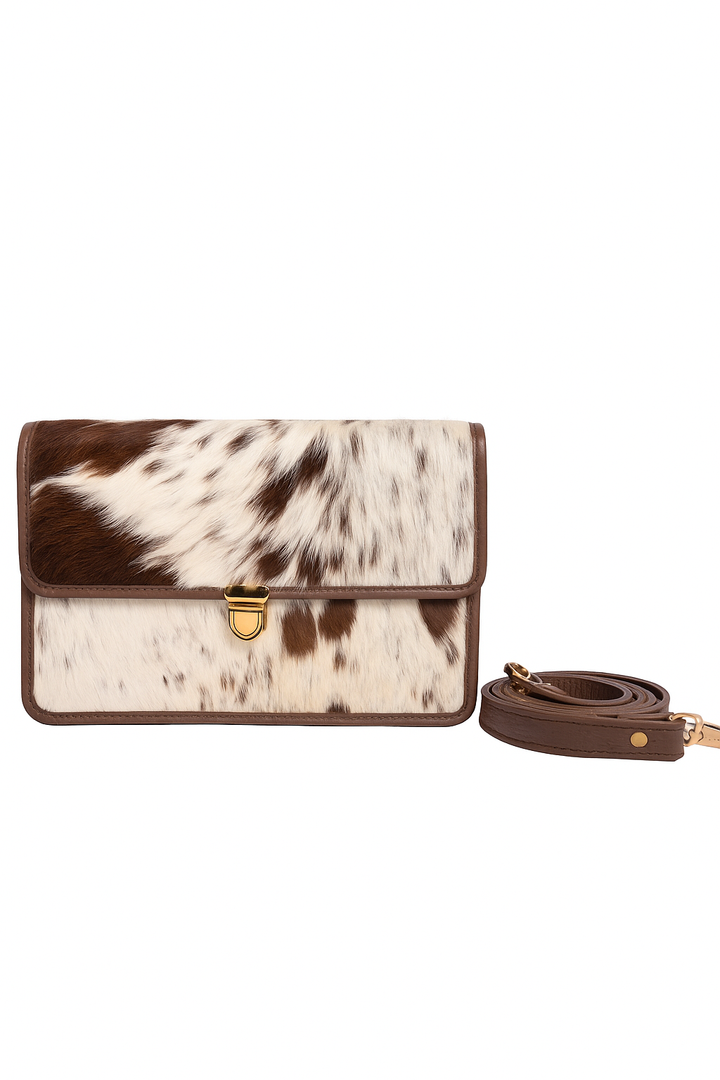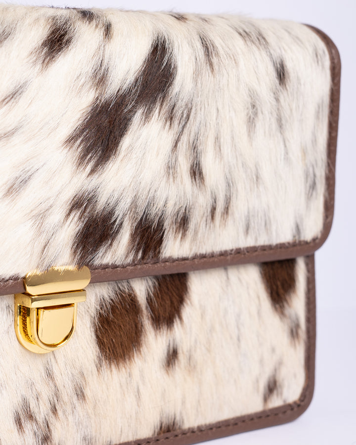Premium hair-on genuine leather featuring a soft, tactile fur surface with a luxurious feel. The smooth leather trim and detachable strap add durability and elegance, while the gold-tone clasp enhances its refined finish