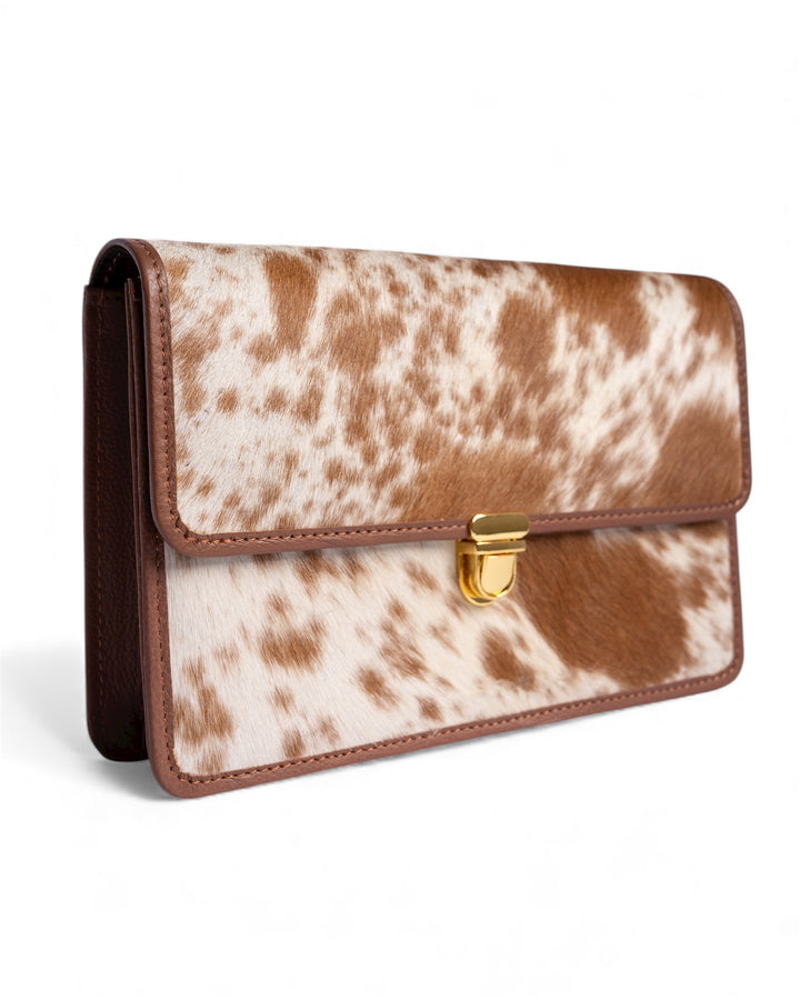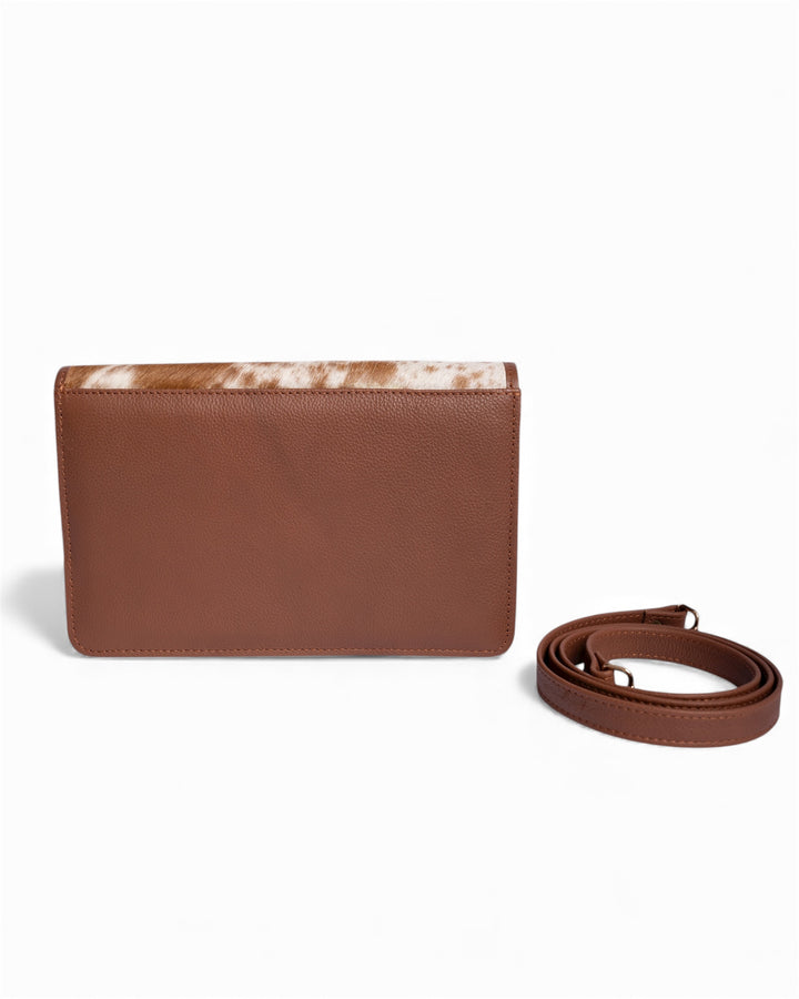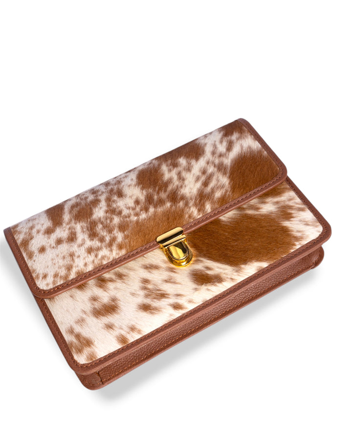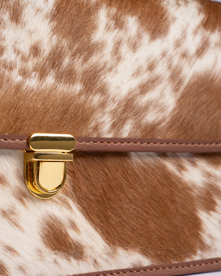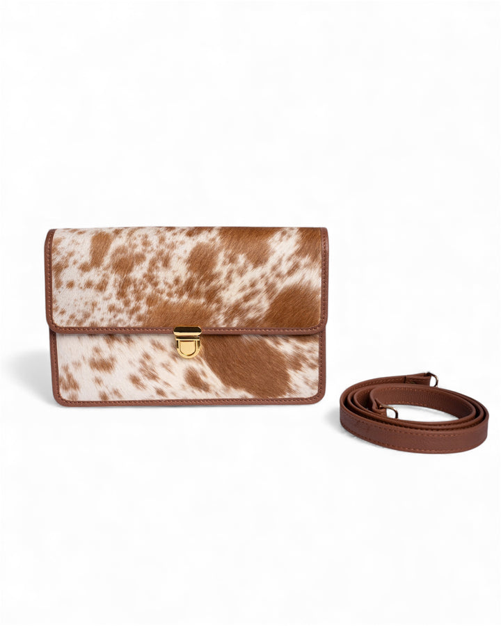 Premium hair-on genuine leather featuring a soft, tactile fur surface with a luxurious feel. The smooth leather trim and detachable strap add durability and elegance, while the gold-tone clasp enhances its refined finish